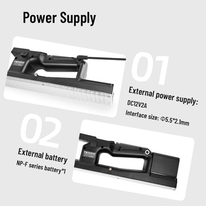 4. The LED video light can be powered by NP-F series batteries or DC12V 2A power adapter. The ergonomic battery box maintains gravity balance for easy handheld use.